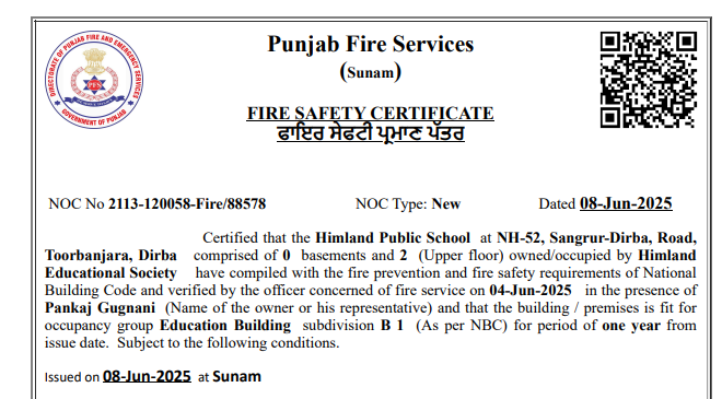 Certificate ensuring the school meets the prescribed fire safety norms.