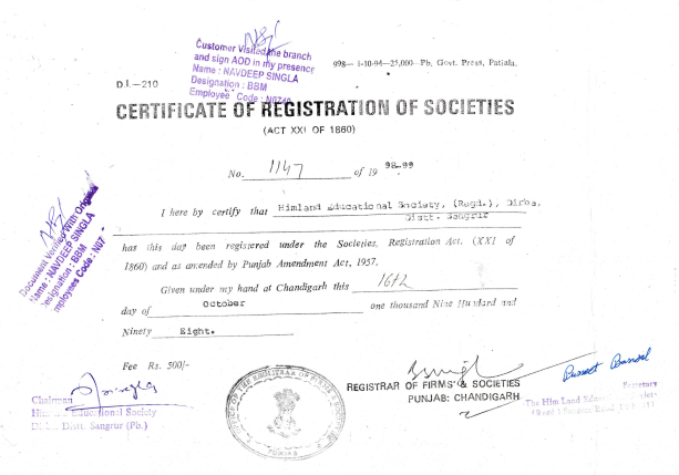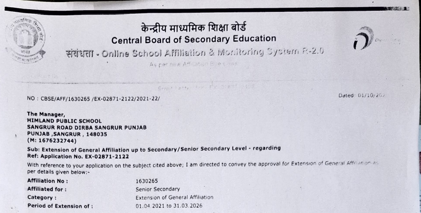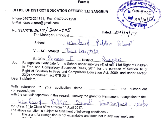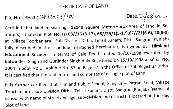 As per government requirements, the following official certificates of Himland Public School are made available here for transparency and easy public access. You can download each certificate using the link provided.